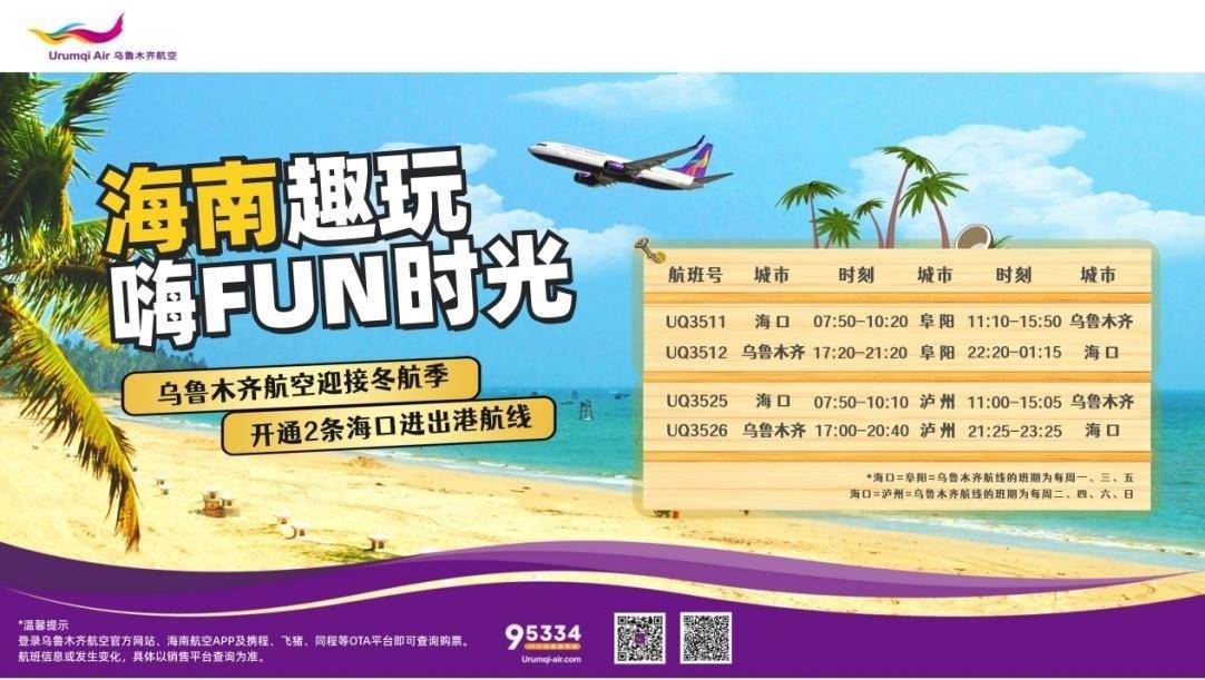 海口=阜阳=乌鲁木齐航线于10月27日开通,班期为每周一、三、五。去程UQ3511航班,07:50从海口美兰国际机场起飞,10:20抵达阜阳机场,11:10从阜阳机场起飞,15:50到达乌鲁木齐天山国际机场;回程UQ3512航班,17:20从乌鲁木齐天山国际机场起飞明福今投,21:20抵达阜阳机场,22:20从阜阳机场起飞,次日01:15到达海口美兰国际机场。